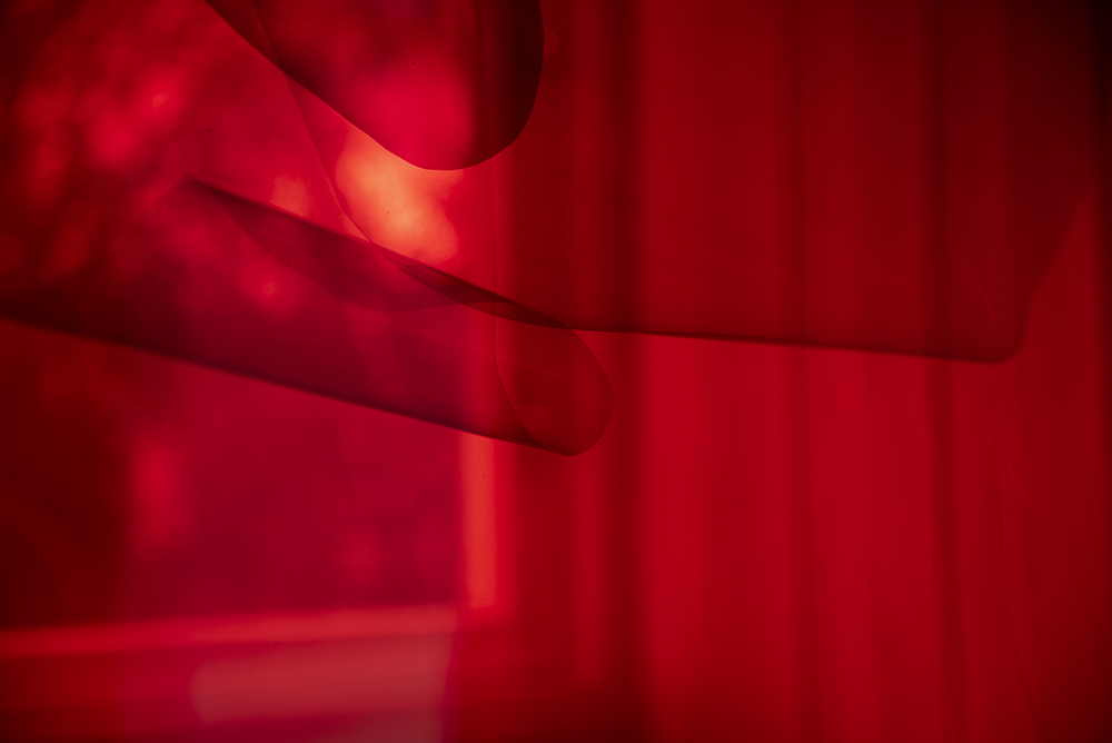 Installation with four large scale paintings, light filters, wood, and printed photographs.